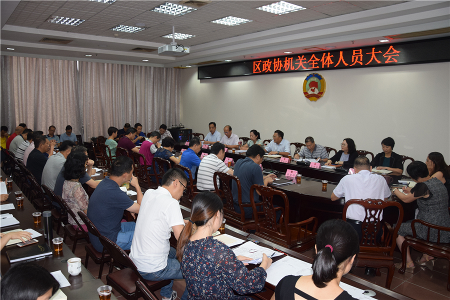 7月23日下午,区政协在四楼会议室召开机关全体人员会议。区政协主席陈家飞,副主席徐兆东、邵靖、李荣渝、全泰源、姚晓群,秘书长杨越敏及机关全体人员参加了会议。