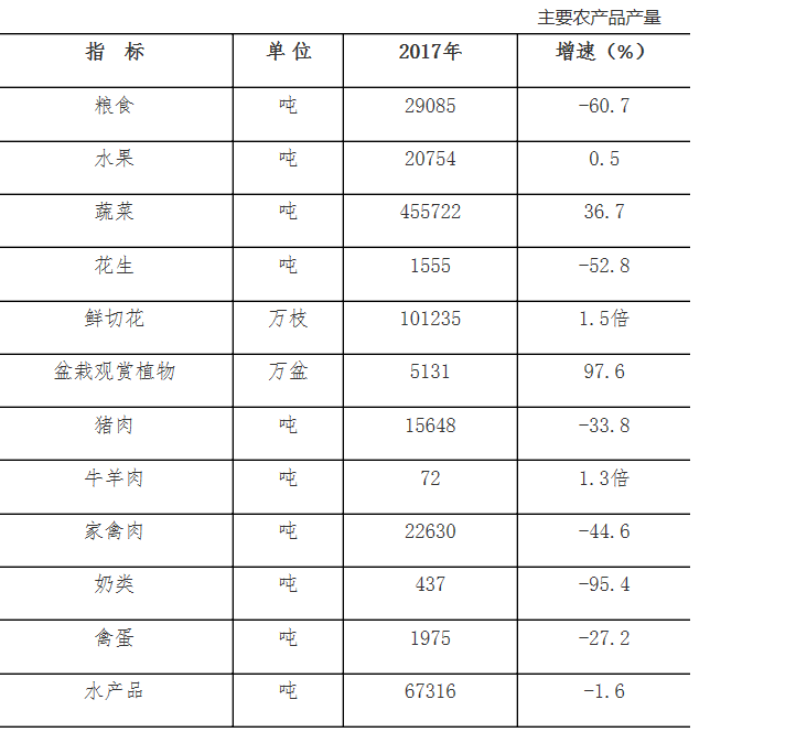 全年农作物播种面积46.89万亩,比上年下降2.9%;水果种植面积6.08万亩,上升12.3%。农作物中,粮食作物播种面积8.84万亩,下降59.1%;蔬菜种植面积27.82万亩,增长40.6%;花卉种植面积6.8万亩,增长1.4倍。