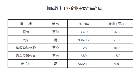 按行业分,规模以上企业中,工业总产值排前五位的依次是:(一)汽车制造业产值1319.83亿元,增长4.4%,其中汽车整车产值1017.59亿元,同比增长5.3%,汽车零部件产值300.30亿元,同比下降3.7%;(二)皮革、毛皮、羽毛(绒)及其制品业产值68.34亿元,同比下降4.2%;(三)纺织服装、服饰业产值54.41亿元,同比下降2.9%;(四)通信设备、计算机及其他电子设备制造业,完成工业总产值47.87亿元,同比增长4.1%;(四)橡胶和塑料制品业产值44.21亿元,同比下降0.9%。这五大行业全年共完成工业总产值1534.66亿元,占规上企业产值的78.0%。