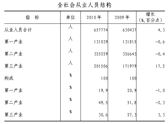 2010年,城镇新增登记失业人员3203人,登记失业率为1.6%。全年安置城镇就业人数2974人,城镇登记失业人员再就业率达72.4%。