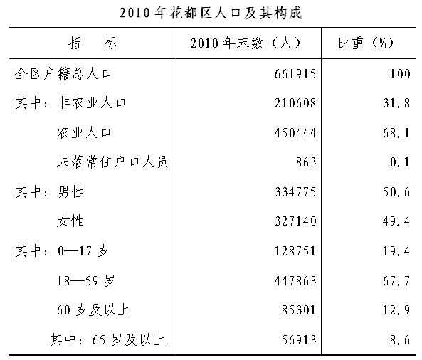 人口:2010年末,全区总人口66.19万人,比上年增长1.6%,其中非农业人口21.06万人,农业人口45.04万人,未落常住户口863人;男女性别比(以女性为100)为102.33;家庭户均人数3.07人。全年出生8894人,死亡2996人,人口出生率13.74‰,死亡率4.63‰,自然增长率9.11‰。