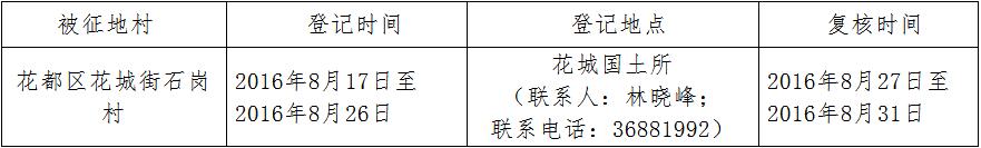 经省人民政府批准(粤国土资(建)字[2016]426号文),需将广州市花都区花城街石岗村属下的集体土地8.7115公顷(合130.6725亩)征收为国有土地。现将经依法批准的《征收土地方案》和市人民政府批准的《征地补偿安置方案》内容和有关事项公告如下: