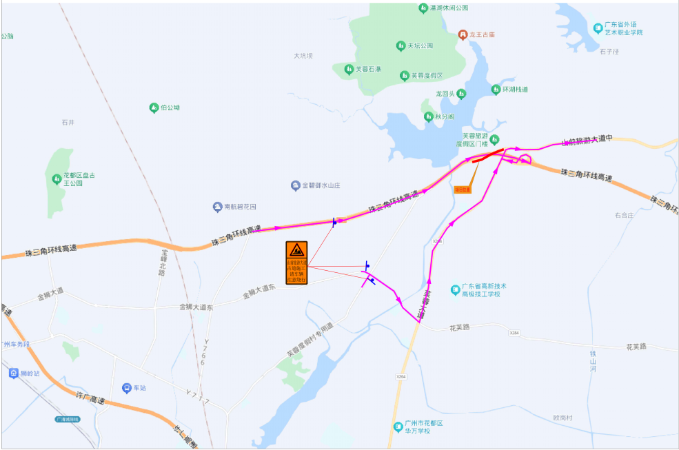 因连通管道工程建设需沿山前旅游大道(狮岭镇瑞边村,芙蓉嶂水库以东,山前旅游大道北侧)开挖现状道路并进行供水管道安装。根据已批复的交通疏导方案和路政审批许可,准许施工时间为117天(2024年11月12日至2025年3月11日)。目前,已围蔽山前旅游大道(芙蓉嶂水库北侧车道及中央绿化带)。为加快项目施工进度,需增设施工作业点。现公司将于2024年12月11日至2025年1月25日山前旅游大道与芙蓉大道路口红绿灯段进行围蔽施工(项目位置图如下):