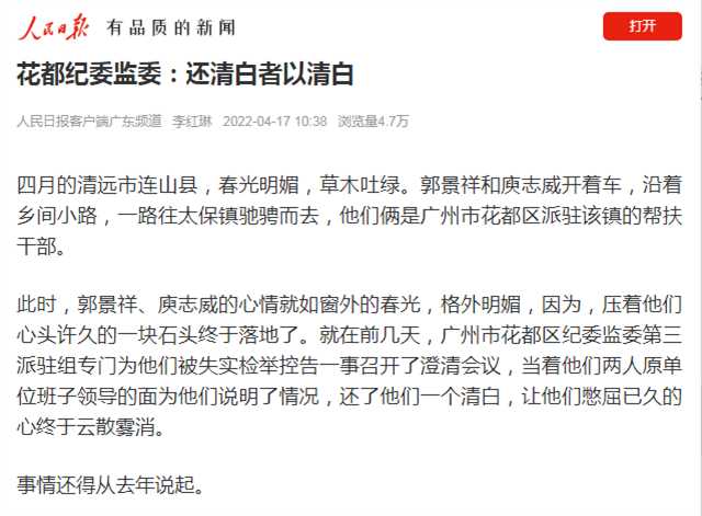 (人民日报客户端刊登我委《花都纪委监委:还清白者以清白》一文)