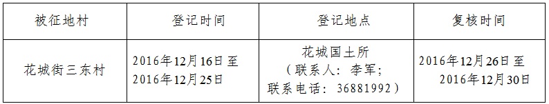 经省人民政府批准(粤国土资(建)字〔2016〕280号文),需将广州市花都区花城街三东村属下的集体土地2.9068公顷(合43.6020亩)征收为国有土地。现将经依法批准的《征收土地方案》和市人民政府批准的《征地补偿安置方案》内容以及有关事项公告如下: