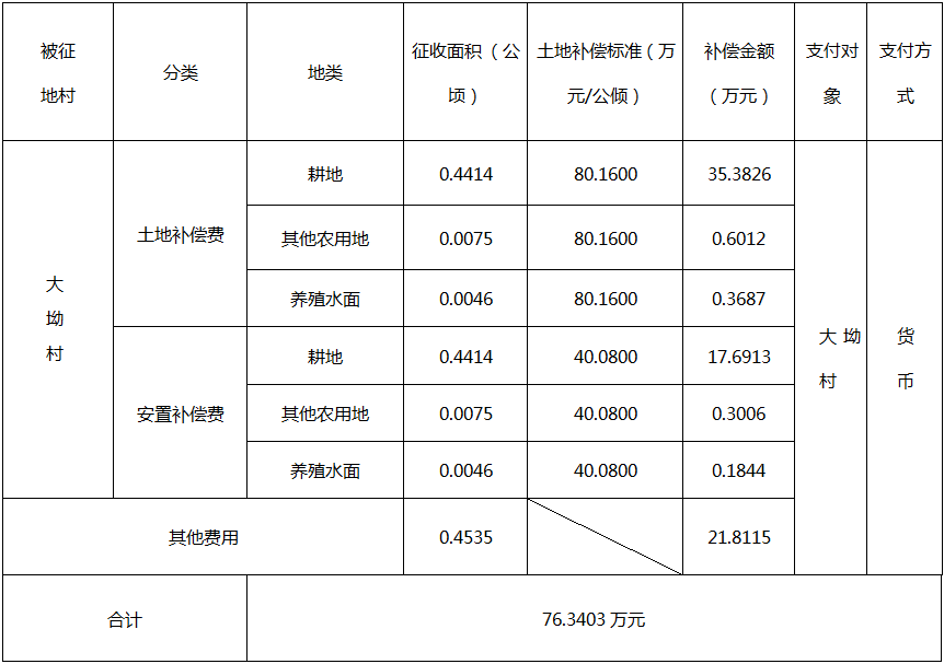 花都区炭步镇大坳村集体土地合计0.4535公顷(合6.8025亩),其中耕地0.4414公顷(合6.621亩)、其他农用地0.0075公顷(合0.1125亩)、养殖水面0.0046公顷(合0.069亩);